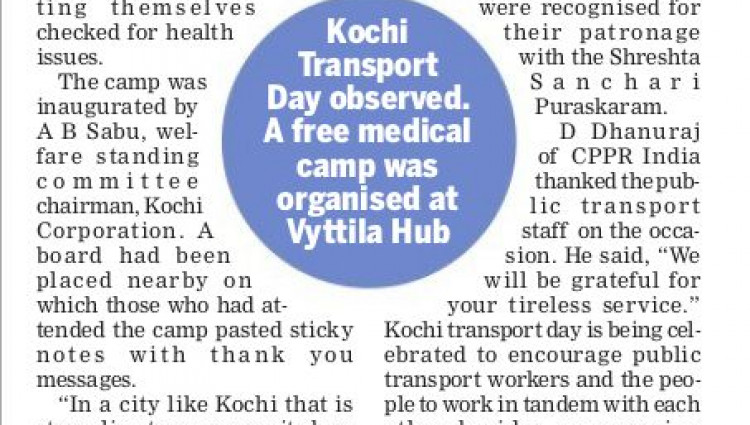 KOCHI: As part of the second edition of Kochi transport day, a free medical camp was organised for bus drivers at Vyttila bus terminal. Centre for Public policy research (CPPR) in association with Aster Medcity conducted the one-day camp which saw hundreds of public transport staff getting themselves checked for health issues.